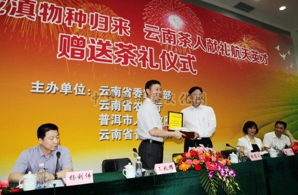 随着神舟九号飞船返回舱成功着陆,由云南省普洱市精心选送的普洱茶短节白毫籽种、普洱咖啡籽种和思茅松籽种三个物种也结束太空之旅返回地面。7月1日,云南省委宣传部、云南省农业厅、普洱市政府和云南省普洱茶协会共同组织云南企业家代表齐聚北京航天城,接收随“神九”归来的云南物种,并向航天功臣及航天人赠送普洱茶和普洱咖啡表示崇高的敬意和诚挚的慰问答谢。