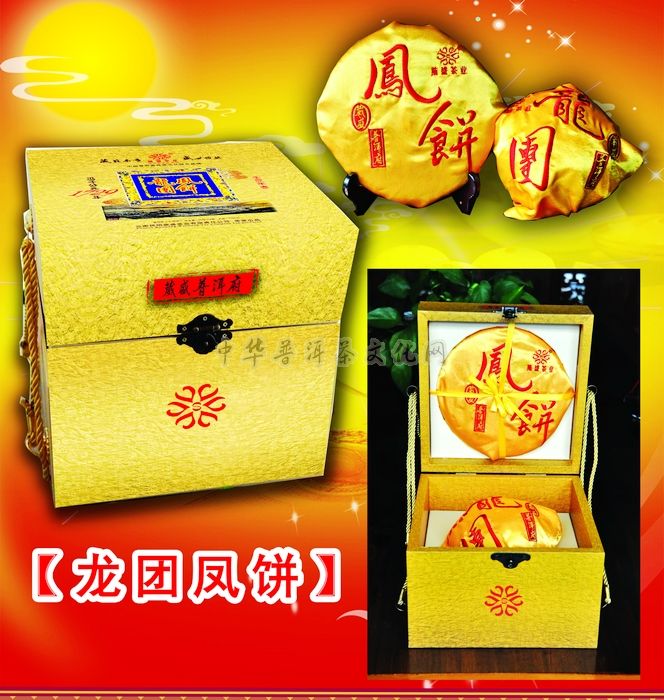 为传承历史,弘扬名茶,让现代人也能品茗到古时皇家享用的普洱贡茶。葳盛茶业深度挖掘普洱历史文化,根据清代阮福《普洱茶记》卷中“普洱茶名遍天下,味最酽,京师尤重之。”寻找百年以上古茶山乔木古茶树,精心挑选云南大叶晒菁春茶,并在原制作工艺上不断探索创新,于壬辰年研发出了该款高品味的岁月普洱。在中国传统的吉祥图案中,《龙凤呈祥》体现中国文化艺术的元素。画面上,龙、凤各居一半。龙是升龙,张口旋身,回首望凤;凤是翔凤,展翅翘尾,举目眺龙。周围瑞云朵朵,一派祥和之气。葳盛茶业将历史普洱与现代普洱相结合,在龙年特别推出了普洱府“龙团凤饼”, 以现代普洱茶(熟茶)的制作工艺制成的“龙团”,以乔木大叶种古树晒青原料制成的“凤饼”,寓于吉祥如意,以此献给广大爱茶人士。