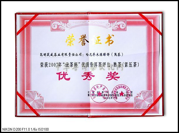 2007年10月份葳盛茶业的“哈尼乔木陈醇饼”在“云茶杯”优质普洱茶评比熟茶(紧压茶)活动中评为优秀奖 公司邮箱:ws357Tea@126.com 公司网站:中华普洱茶文化网 公司网址:http://www.zhpecwh.cn 公司地址:云南省昆明市关上宝海路163号 联系电话: 0871—63559399(办公室) 全国尊享热线:400 0977 357 在线QQ联系:348058891 564855862