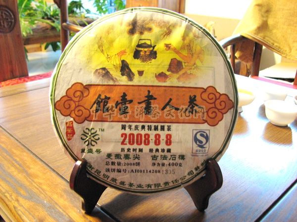 2006年8月8日,葳盛茶业第一款【茶人书壶馆】诞生,一套五片,每片400克,选用澜沧江流域江内外的易武、蛮砖、倚邦、布朗、无量山系最具综合代表性的五大茶山大叶种古树茶箐为原料。