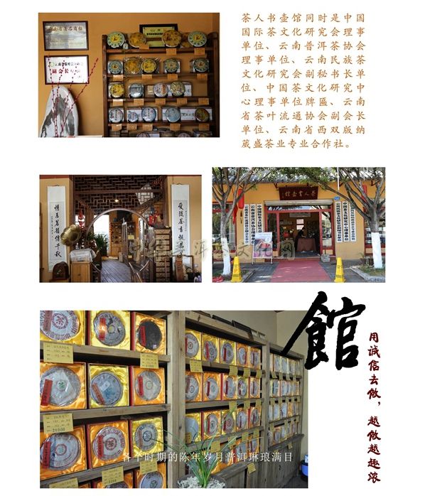 2013年重新打造了更加精致独具韵味的精巧套装【茶人书壶馆】普洱茶,由中国十大杰出书法家之一的单永钦老师亲笔题词,充分融合了中国传统文化、历史文化、书画文化及普洱茶文化的丰富内涵,是中国茶道精神在当代茶文化事业中的具体体现,是弘扬和传承普洱茶文化的精品代表。“茶、人、书、壶、馆”五个字包含着做人、做事、修身的人生哲理,这五片茶原料分别采用澜沧江流域江内外的倚邦、苦竹、蛮砖、布朗、易武最具综合代表性的五大著名茶山大叶种古树茶菁,集纳了云南高山云雾出好茶的乔木大叶种古树茶的色、香、味、形、韵的精华与特点,是真正无公害、无污染的绿色健康饮品,每片250克,全球限量收藏999套。