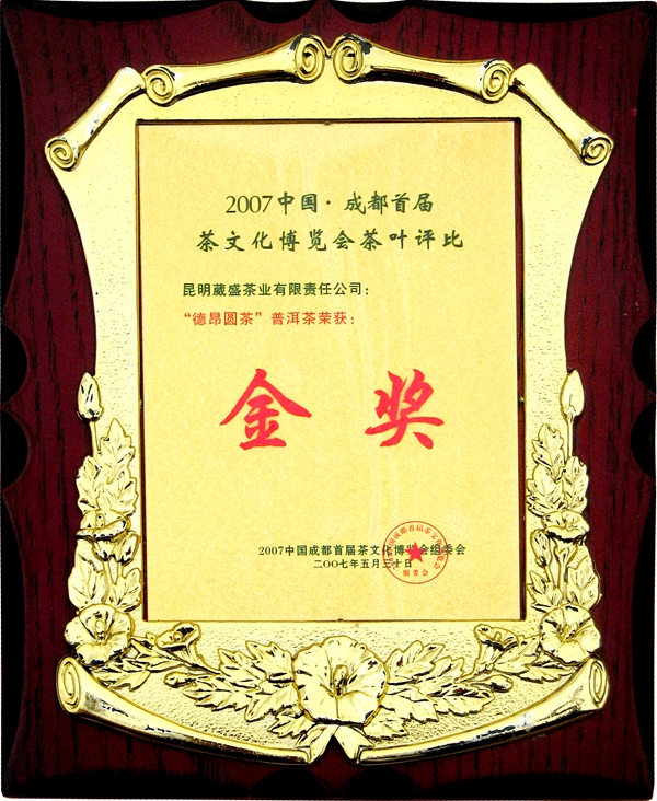 2007年葳盛茶业参加中国·成都首届茶文化博览会,其中“德昂圆茶”在茶叶评比中荣获“金奖”