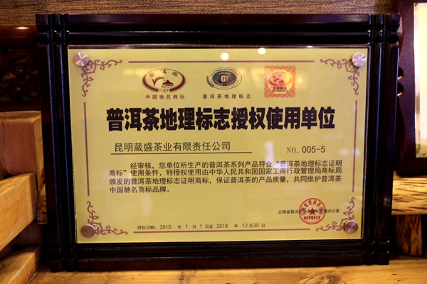 2013年葳盛茶业荣获“昆明茶叶行业协会会长质量奖”及“滇茶老字号”荣誉称号
