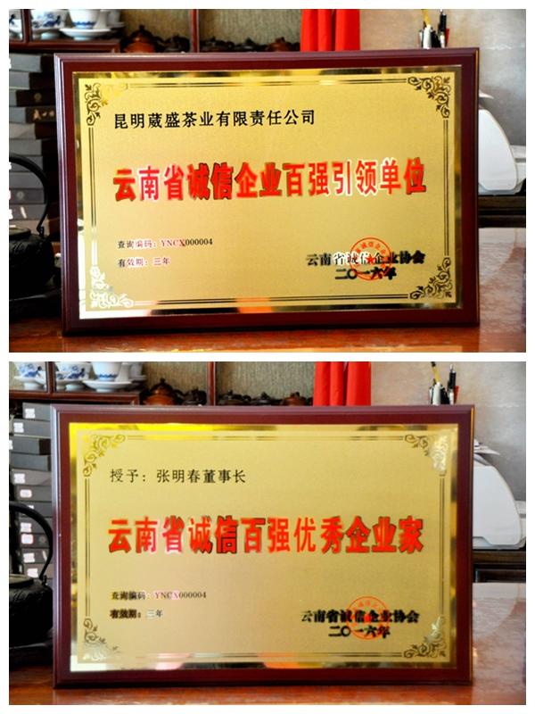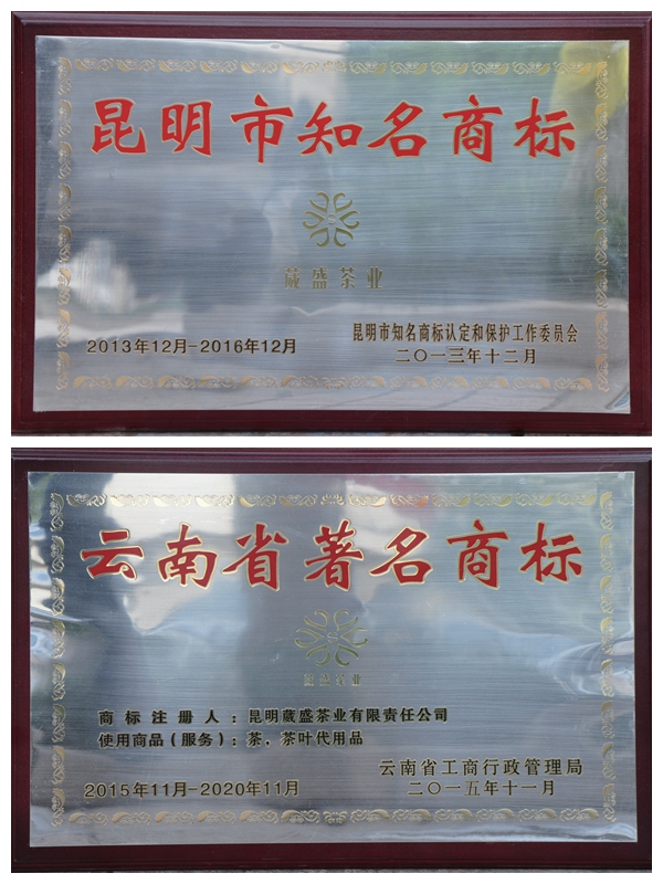 2010年葳盛茶业荣获“昆明市知名商标”及“云南省著名商标”荣誉称号