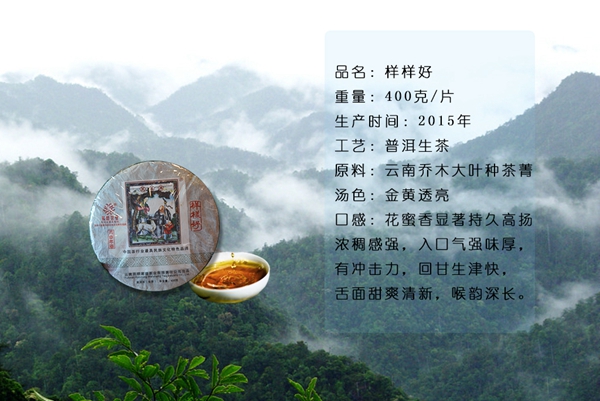 【葳盛牌样样好】普洱茶是云南生态、质朴、纯真的普洱茶代表,该茶品于2011年春精心研制开发,以普洱茶民间传统工艺精制而成,2013年春开发研制出中国吉祥文化与普洱茶文化的完美结合之尚品“大吉祥 葳盛牌样样好”,继2013年之后2015年开发精制“葳盛牌样样好”。在这快节奏的现代生活中,和谐是喜,平安是福,快乐是金,宁静是宝,样样好已成为人们表达美好祝愿的佳音。
