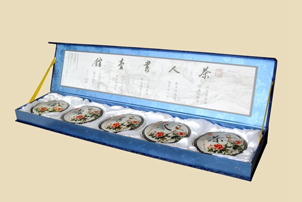 2006年8月8日,葳盛茶业第一款【茶人书壶馆】诞生,一套五片,每片400克,选用澜沧江流域江内外的勐宋、易武、巴达、景谷、无量山系最具综合代表性的五大茶山大叶种古树茶箐为原料。