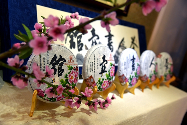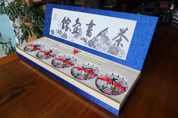 首批2006年【茶人书壶馆】茶是由5个不同山头的古树组合而成的。每片400克,选料分别是:茶—勐宋、人—易武、书—巴达、壶—景谷、馆—无量山 。再加上精心设计的精美礼盒 ,以蓝色为底,山水画为图,清雅朴素,内中白色缎匣底衬与石模精压的5饼茶组十分和谐。每饼茶的外包装纸是花鸟图案,十分幽雅,特别而精制的证书上有云南普洱茶协会会长张宝三、云南民族茶文化研究会会长李师程的题词和签名。限量999套,现在售价22500元/套。