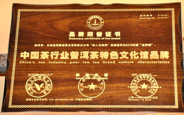 2016年茶人书壶馆十周年到来之际,享有茶界品牌“奥斯卡”之称的“金芽奖”中国茶品牌颁奖典礼在深圳秋季茶博会开展期间盛大举行。云南昆明葳盛茶业有限责任公司【茶人书壶馆】品牌荣膺“中国茶行业普洱茶特色文化馆品牌”。经过十年发展,“茶人书壶馆”已经发展成为了集普洱茶价值与文化价值为一体的普洱茶经销加盟品牌。历经十年,十年的茶醇香,十年的人相知,十年的书博识,十年的壶涵养,十年的馆情趣。