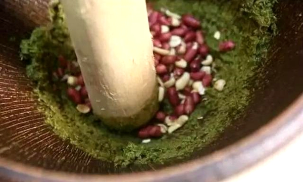 茶叶、花生、葱姜蒜一起放入石臼里捣碎,下锅炒干炒香,再加入水熬煮一会即可。