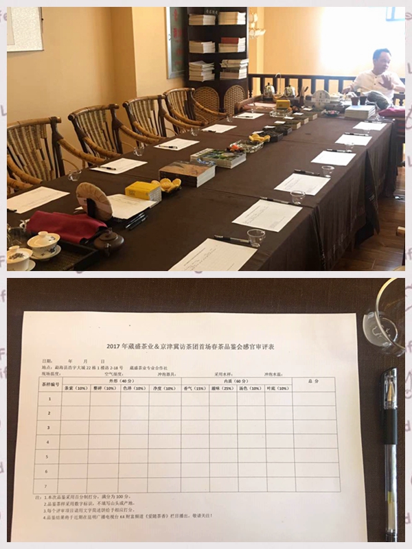 品鉴会以“盲品”的形式进行,选取2017年六款春茶进行编号盲品,专业打分,评选出最受欢迎的茶品。评分采用百分制,满分为100分,外形(条索10分、整碎10分、色泽10分、净度10分)占40分,内质(香气15分、滋味25分、汤色10分、叶底10分)占60分。京津冀滇茶道师负责冲泡,评分人员有尹纪周、赵曙光、肖思学、王霞等京津冀访茶团所有代表,勐海县政协副主席钱胜华、茶叶局局长陈强为评委,对各款春茶进行冲泡、盲品及专业评分。