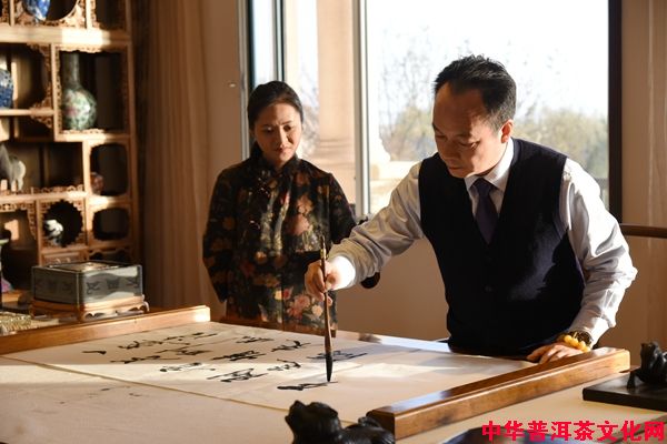 张明春先生在李海龙先生的办公室现场书写“一盏清茗酬知音,情来朗爽满天地”,抒发与茶友之间的情谊。