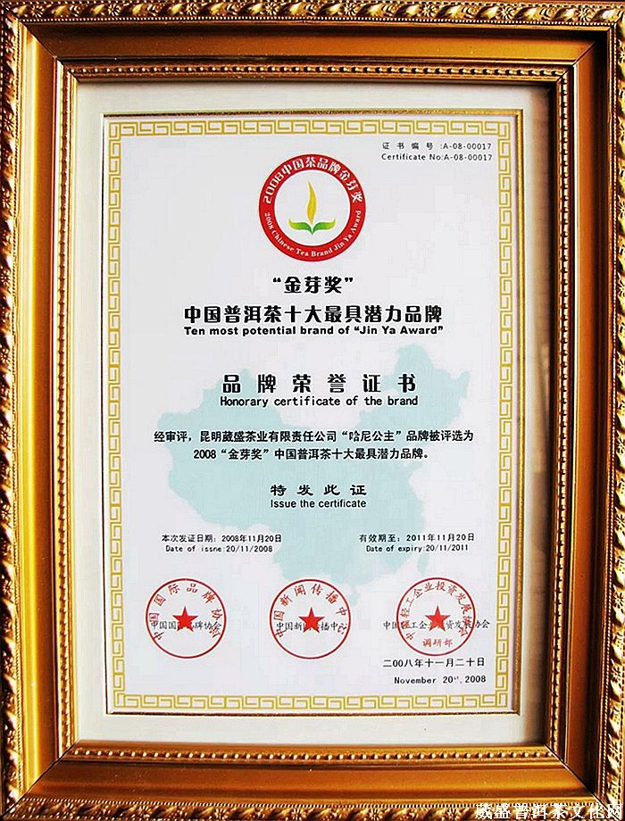 2008年年底,由《云南经济日报》和昆明葳盛茶业公司联合举办《葳盛杯 我与普洱茶》全国有奖征文活动,广大爱茶人士纷纷参与。各种关于普洱茶的评选活动火热进行,其中中国茶品牌(普洱)“金芽奖”、“陆羽奖”品牌评选活动尤为引起人们的关注,通过评选“哈尼公主”品牌荣获金芽奖“中国十大最具潜力品牌”。