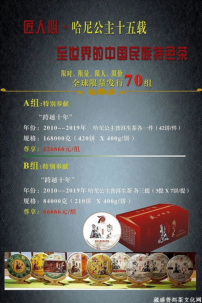 时至2019年 ,哈尼公主茶面市已年满十五周年。为了感谢茶友们近二十年来的支持与厚爱,同时为了庆祝哈尼公主茶十五周岁生日,葳盛茶业《匠人心·至世界》哈尼公主十五周年—献给世界的中国民族特色茶特别活动将于6月底盛大开启: