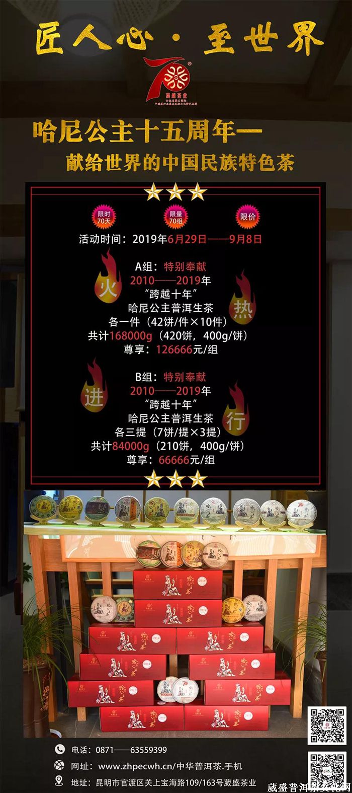 本套装为十年哈尼公主茶特别定制套装,内含2010——2019年哈尼公主茶各一饼,外观精致,彰显贵气,作为中国最具民族特色品牌的特定套装,实至名归!继6月29日葳盛茶业推出“匠人心·至世界”哈尼公主十五周年,献给世界的中国特色茶特别活动,此次定制套装葳盛茶业将对参与活动的茶友(A、B组)各配一套,作为对茶友们全力支持的衷心感谢,同时,后续参加活动的茶友也有机会配得一套最新十年组合套装。