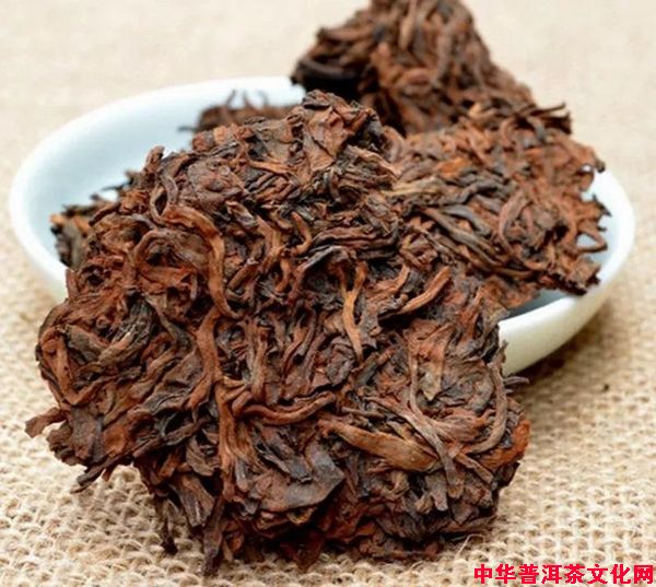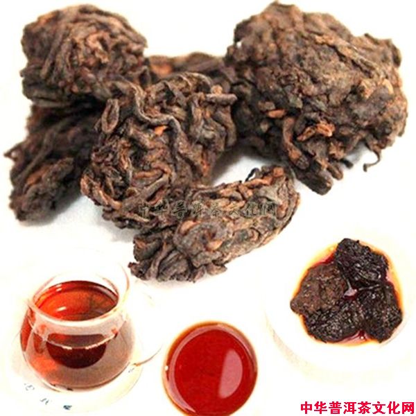 这些果胶会把周围的茶叶粘连在一起,变成一团一团的,发酵到一定程度后,这些一团一团的茶叶被挑拣出来,经过人工分解成小块。由于是自然结块,没有经过人工的修饰,它的品相并不好看,就像是一小块一小块的深褐色的面疙瘩,所以又被称为“疙瘩茶”。
