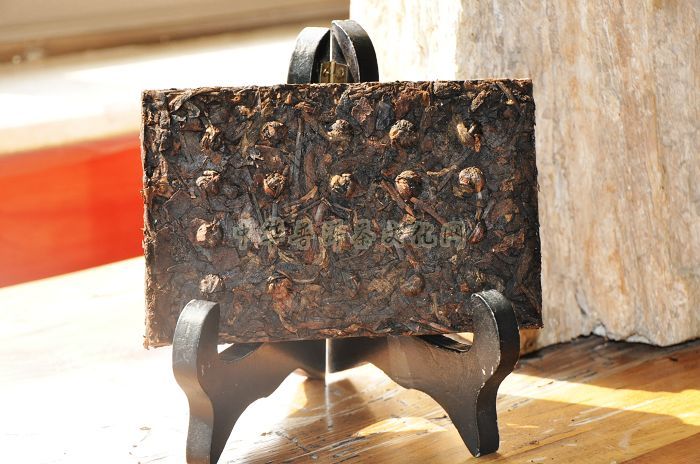 哈尼乔木古树砖档案:葳盛茶业2004年采用昆明茶厂7581传统的熟茶制作工艺及制茶经验精心制作而成。该茶采用无量山乔木古树茶菁制成。重250克、长14cm、宽9cm、厚3cm,为乔木大叶古树茶砖,用质朴的竹笋壳包装,茶砖茶面呈深褐色,色泽均匀、洁净,茶身结实,整体砖形规矩,底部有特用铜模压制的乳钉,汤色酒红、清澈油亮,绝非一般色深褐红的普通茶品可比拟。其色、香、味、韵、陈方面综合表现较好。色:红浓明亮;香:枣香;味:滋味醇厚甘甜;韵:悠长柔顺;陈:有陈香感。该茶品2004年问世,备受社会各界的青睐。