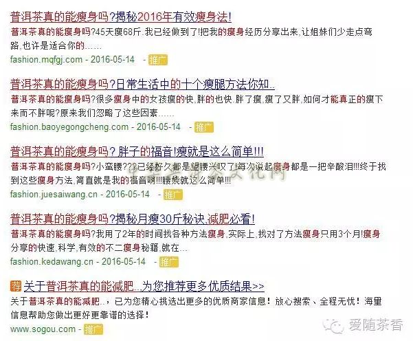 近日,小编打开搜索,输入“普洱茶真的……”还没输入完,马上就跳出“普洱茶真的能减肥吗?”,然后选中,接下来打开的画面一阵无语……