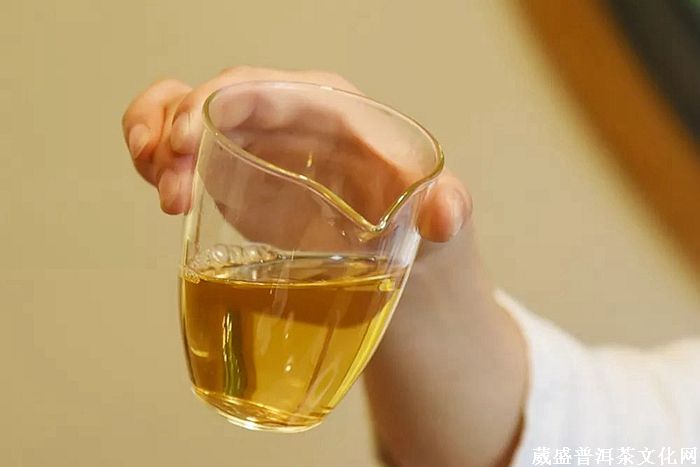 【赏汤闻香】出汤时应紧贴公道杯壁,避免水雾附着杯壁,影响视觉美感;醒茶汤色明黄透亮,挂杯花香飘逸、久久犹存。