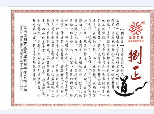 【捌正道】是由国家级制茶工程师张明春先生精心研发独创的经典作品,该茶充分融合了茶禅一味的精神内涵,是中国茶道精神在当代茶文化事业中的具体体现,是弘扬和传承“和静德怡真”的代表作品。捌正道即佛家修行圣道:一、正见:正确的见解。二、正思维:正确的思维意识、观念。三、正语:纯正清净的言语。四、正业:端正的行为。五、正命:正当的职业。六、正精进:正确的修行,使自己的身心臻于完善。七、正念:正确的意识,不忘初心的意念。八、正定:正统的禅定,精神统一,心如明镜止水。捌正道蕴涵着做人、做事、修身的人生哲理。