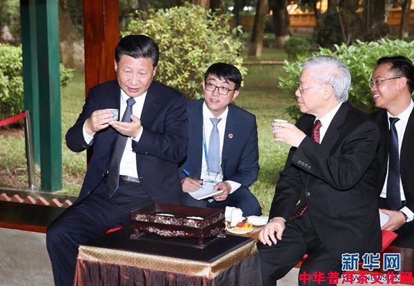 第二次是11月13日上午,阮富仲与到越南访问的习总书记在胡志明故居茶叙。越南的好茶款待最尊贵的客人。两人端坐于高脚屋中,先品越南茶,再喝越南咖啡。交谈中,两人还端起茶杯轻轻碰杯。