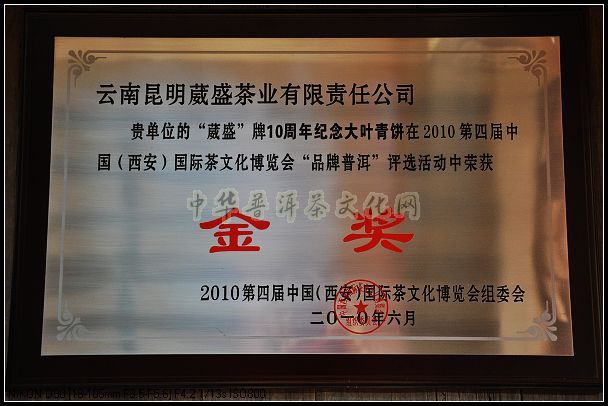 10周年纪念饼获“品牌普洱”金奖