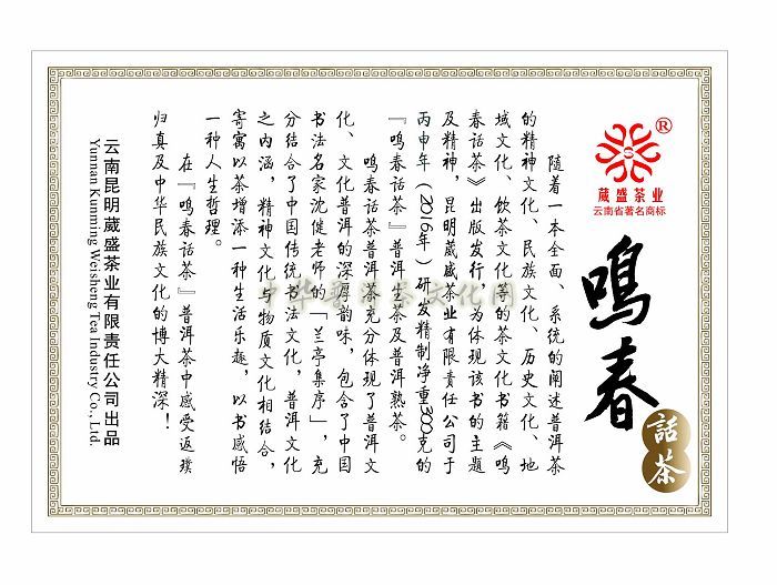 鸣春话茶,是我们今年2016年推出的一款精品,它脱胎于葳盛出版的茶文化书籍——《鸣春话茶》,一本全面系统阐述了普洱茶精神文化、民族文化、历史文化、地域文化、饮茶文化的精刊。酝酿已久后,丙申年(2016年)「鸣春话茶」系列茶叶应运而生,经典再现。