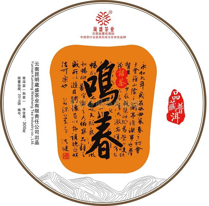 鸣春话茶充分体现了普洱文化、文化普洱的深厚韵味,以中国书法名家沈健老师的兰亭集序为文化底蕴,充分结合了中国传统书法文化和普洱文化,精神文化和物质文化相结合,寄寓以茶,增添乐趣,感悟哲理。