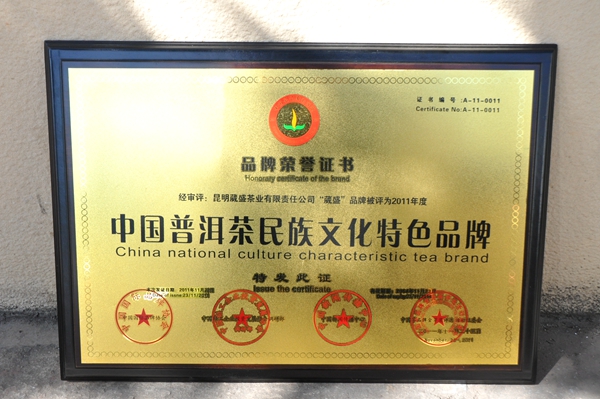 2011年葳盛茶业荣获“中国普洱茶民族文化特色品牌”荣誉称号