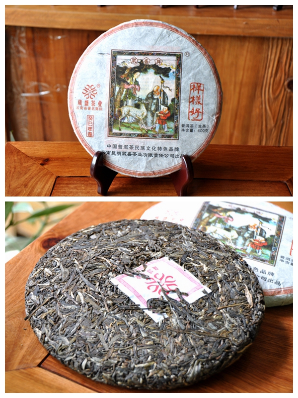 葳盛茶业“葳盛牌样样好”普洱茶上的吉祥图包含了寿星、顽童、梅花鹿、勤劳的姑娘、还有苍劲的松柏,外面以蝙蝠、水仙花、铜钱为主,涵盖吉祥文化福禄寿喜财。寓意:福(蝠)禄(鹿)寿喜,松柏延年,喜悦,祥和之情。
