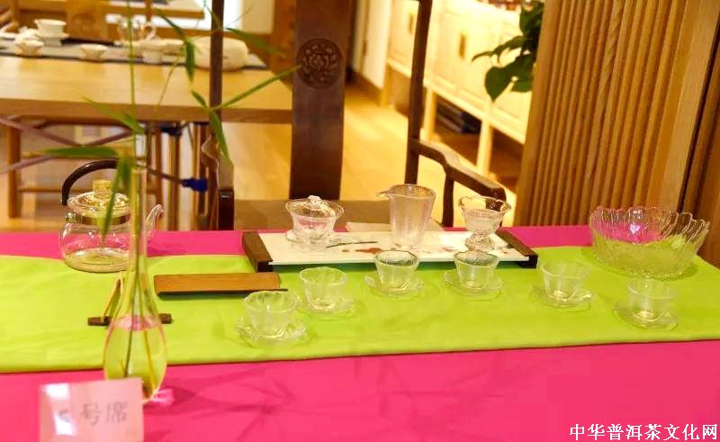 茶席以整块雪纺纱布为底,简单、大气,又有中国风韵,再以一块绿色搭配,仿佛是一片茶叶,清新怡人,茶具选用透明冰纹玻璃,有利于全程观赏茶叶在杯中舒展,观赏茶汤舞动。