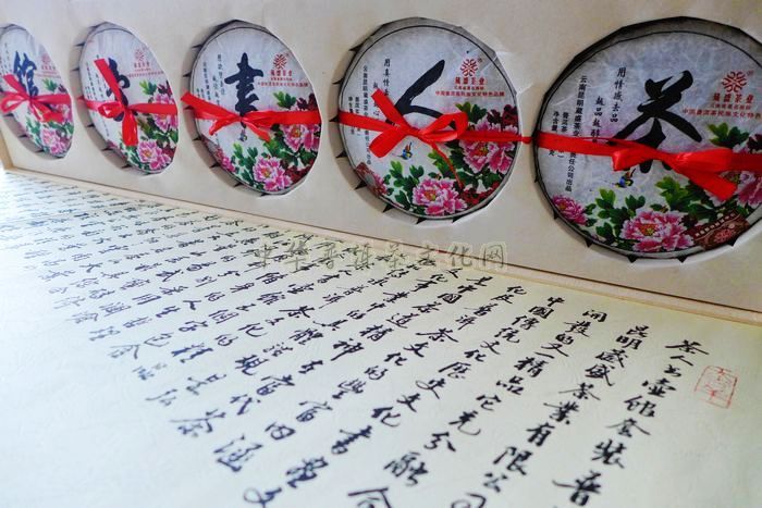 葳盛茶业早在2006年就开发研制的了【茶人书壶馆】套装普洱茶,一套五片茶,每片茶400克,原料分别采用澜沧江流域江内外的易武、蛮砖、倚邦、布朗、无量山系最具综合代表性的五大著名茶山大叶种古树茶菁,集纳了云南高山云雾出好茶的乔木大叶种古树茶的色、香、味、形、韵的精华与特点,是真正无公害、无污染的绿色健康饮品。它不仅浓缩了六大茶山的乔木古树之精粹,更浓缩了一个爱茶人对茶的理解和以茶表达的思想感情和对人生的美好追求。在2006年广州茶博会名优茶品比中荣获金奖。