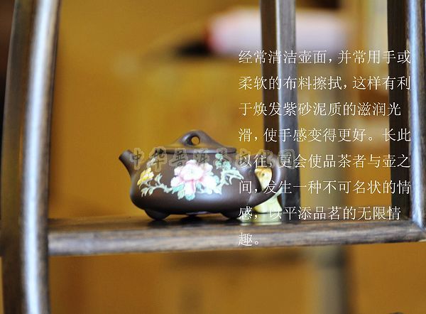 (三)紫砂壶能吸收茶汁,壶内壁不刷,沏茶而绝无异味。紫砂壶经久使用,壶壁积聚“茶锈”,以致空壶注入沸水,也会茶香氤氲,这与紫砂壶胎质具有一定的气孔率有关,是紫砂壶独具的品质。